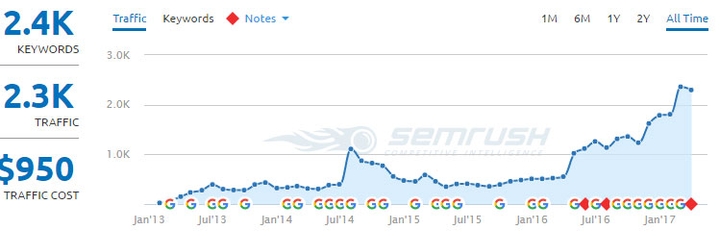As you can see, the organic traffic is perceived to be increasing over time, as I continue to increase my rankings for terms with a high search volume.